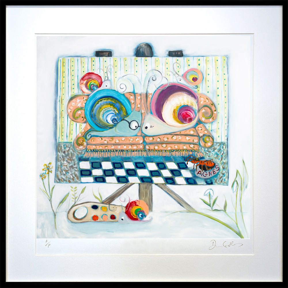 Bring colour, creativity, and joy into your home with The Snail Artist. This limited edition fine art print is taken from Dawn Crothers’ debut children’s book and depicts the Snail Artist painting a lovely portrait of his family.